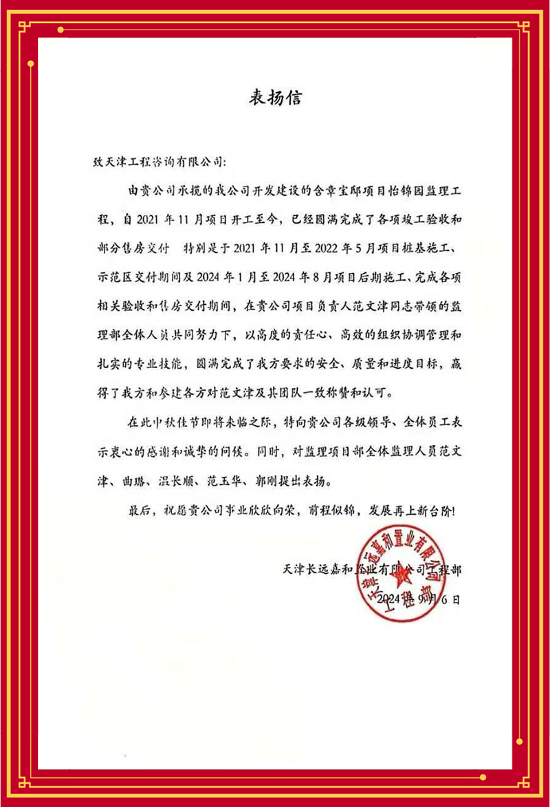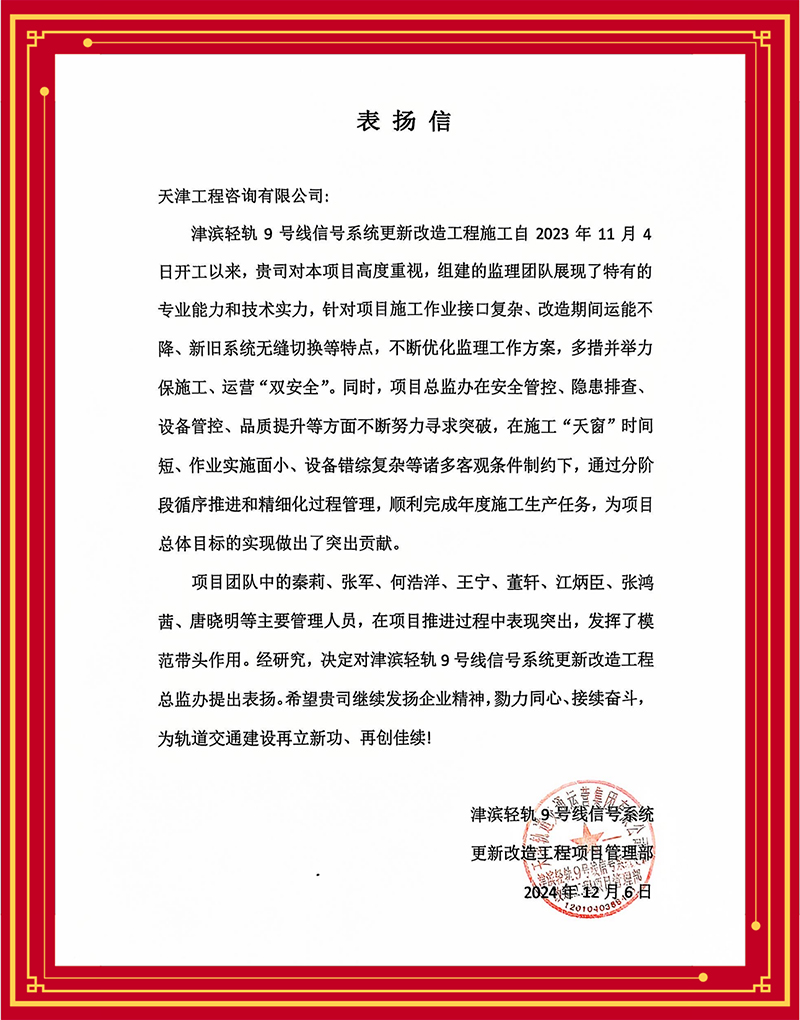 津濱輕軌9號線信號系統(tǒng)更新改造工程項目部感謝監(jiān)理團隊多舉措解決項目施工作業(yè)接口復雜、改造期間運能不降、新舊系統(tǒng)無縫切換等難題,力保施工、運營“雙安全”;天津長遠嘉和置業(yè)有限公司贊賞含璋寶坻項目怡錦園項目監(jiān)理團隊以高度的責任心、高效的組織協(xié)調(diào)管理和扎實的專業(yè)技能推動項目圓滿完成;天津華勘穂金房地產(chǎn)開發(fā)有限公司感謝監(jiān)理項目部主動對接業(yè)主需求,有效管控質量安全,切實保障施工進度,很好地履行監(jiān)理職責......