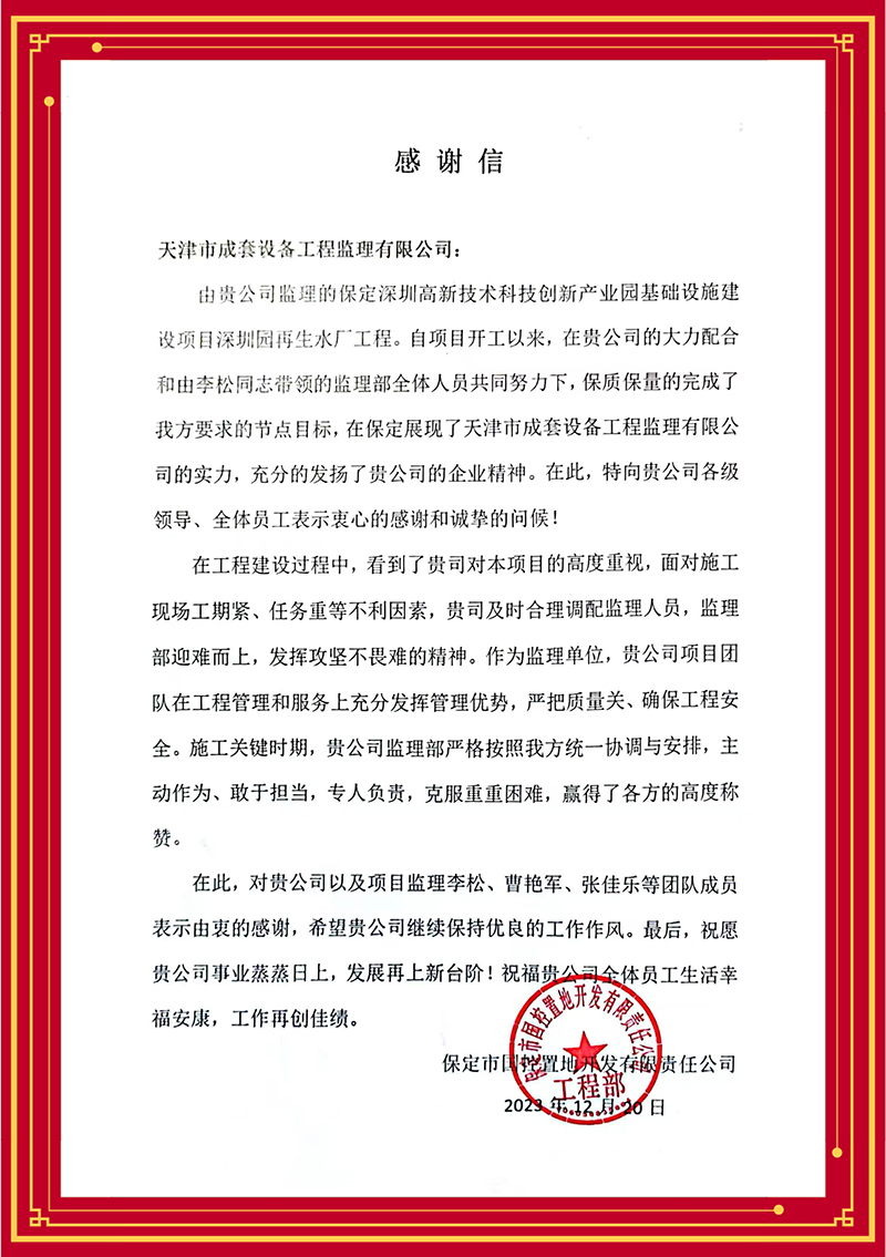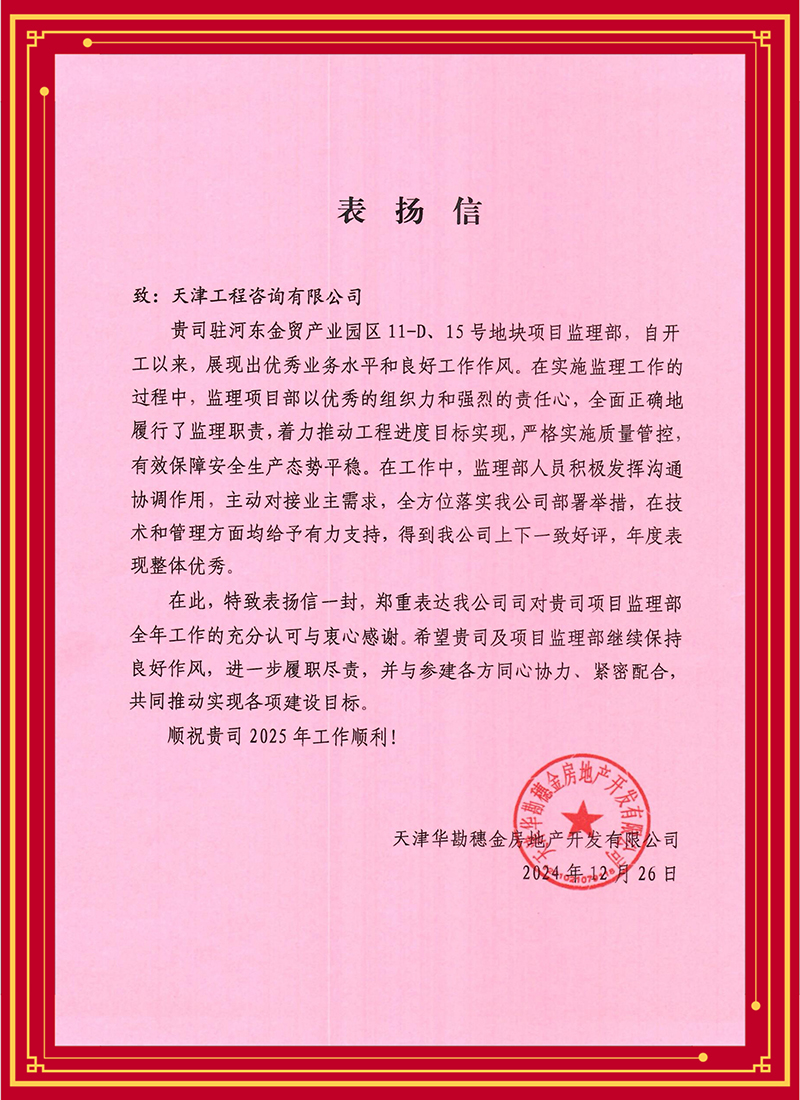 感恩客戶 再接再厲——天津咨詢承擔工程建設監(jiān)理項目獲業(yè)主好評