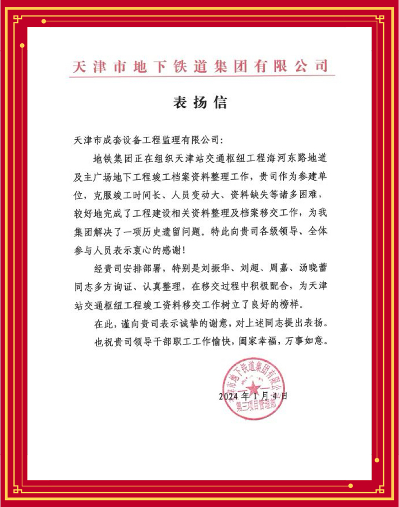 2024年,為持續(xù)深化“1264”戰(zhàn)略體系特別是“六化”舉措,加快推進實體化進程,天津咨詢順利完成吸收合并下屬成套監(jiān)理公司,在持續(xù)打造天津咨詢品牌,以工程監(jiān)理和項目管理為基礎,發(fā)揮在項目建設期的綜合專業(yè)優(yōu)勢,逐步形成“監(jiān)”“管”一體化服務模式方面邁出關鍵一步。近期,多家業(yè)主單位先后發(fā)來感謝信、表揚信,對天津咨詢承擔工程建設監(jiān)理任務給予充分肯定。