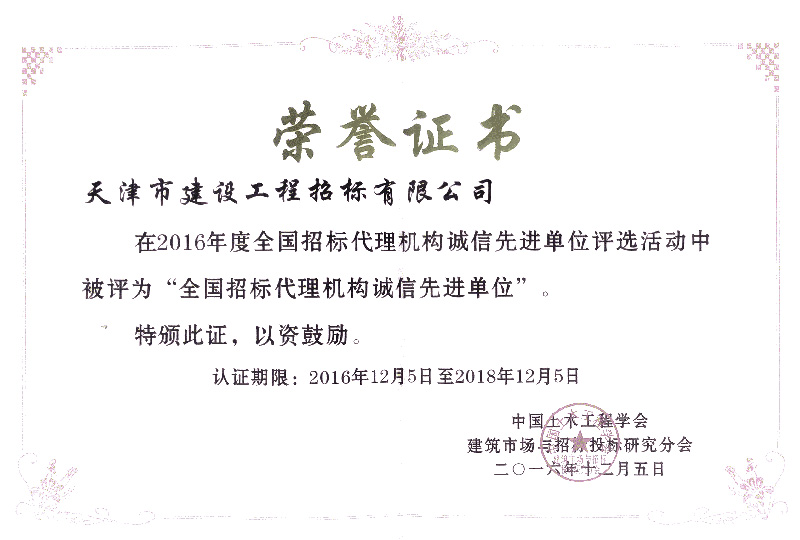 2016年度全國(guó)招標(biāo)代理機(jī)構(gòu)誠(chéng)信先進(jìn)單位 更新時(shí)間:2021-09-24 點(diǎn)擊:1275 所屬欄目:資質(zhì)榮譽(yù)